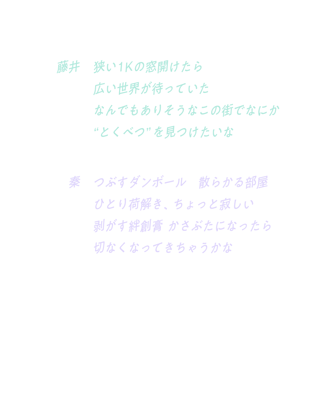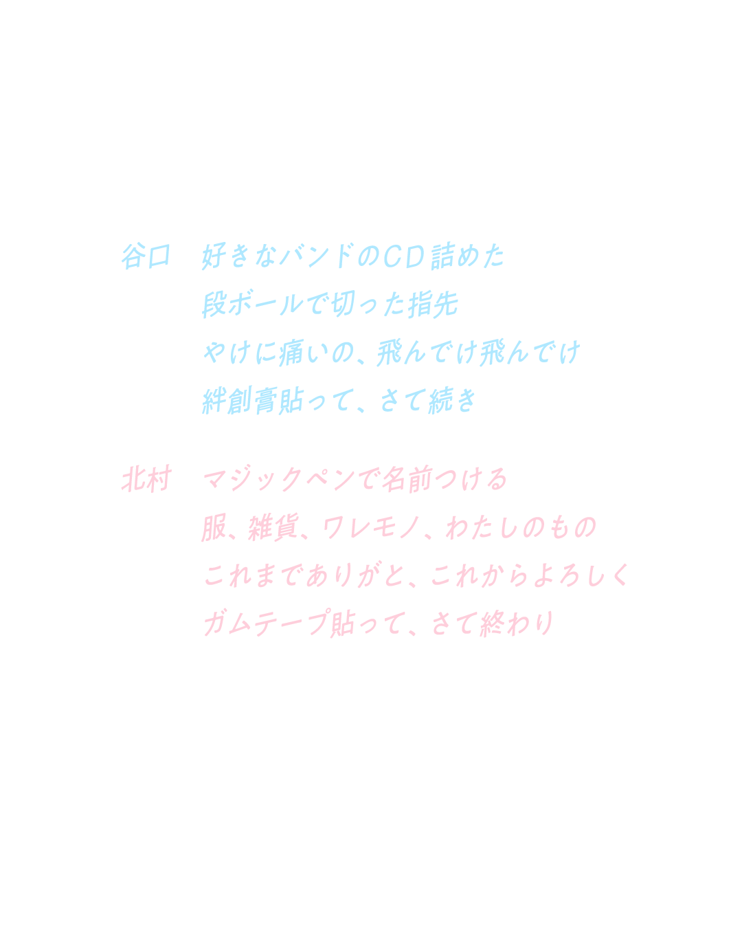 僕も大阪から東京へ上京した経験があるので、上京をして今も大切に持っているもの、引っ越しの時にお別れしたものとか、“引っ越し”という一言だけでもいろんなものが詰まっているなぁと、そこを広げてみようと思いました。