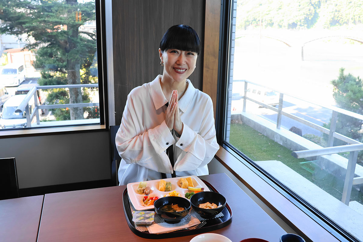 朝食は錦帯橋を望めるレストランで。ビュッフェスタイルで、地元食材を使ったものなど種類豊富な料理が並びます
