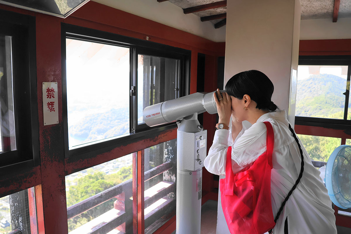 望遠鏡を覗けば錦帯橋や城下町はもちろん、遠くには宮島や瀬戸内海の島々を望めます