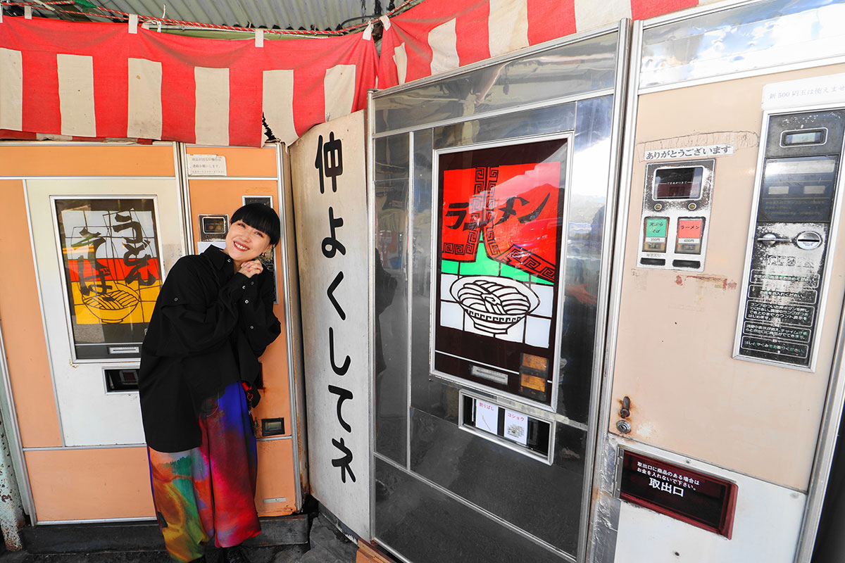 昭和レトロな自販機が残る「欽明館名物自動販売機コーナー」。自販機で熱々のうどんが食べられますよ