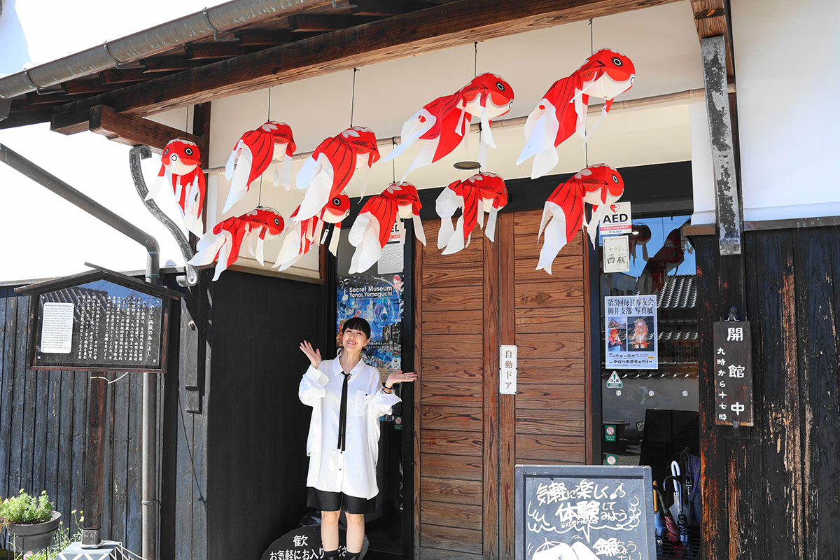 古い醤油蔵を活かした観光施設「やない西蔵」の入り口には、可愛い金魚ちょうちんがずらり