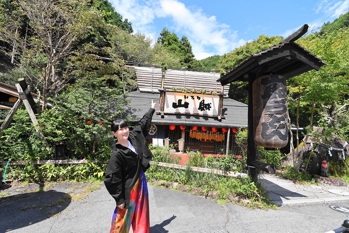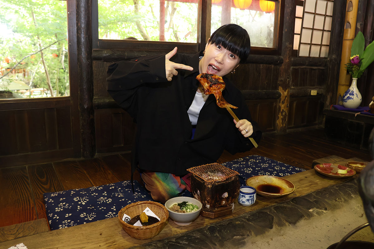 若鶏を香ばしく焼き上げた「山賊焼」や、大きなおにぎりの「山賊むすび」など、ここでしか味わえない豪快な料理が並びます
