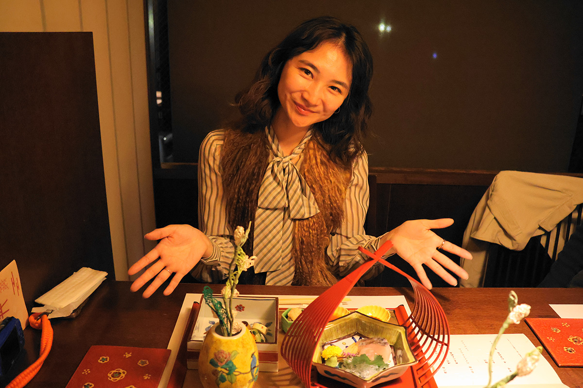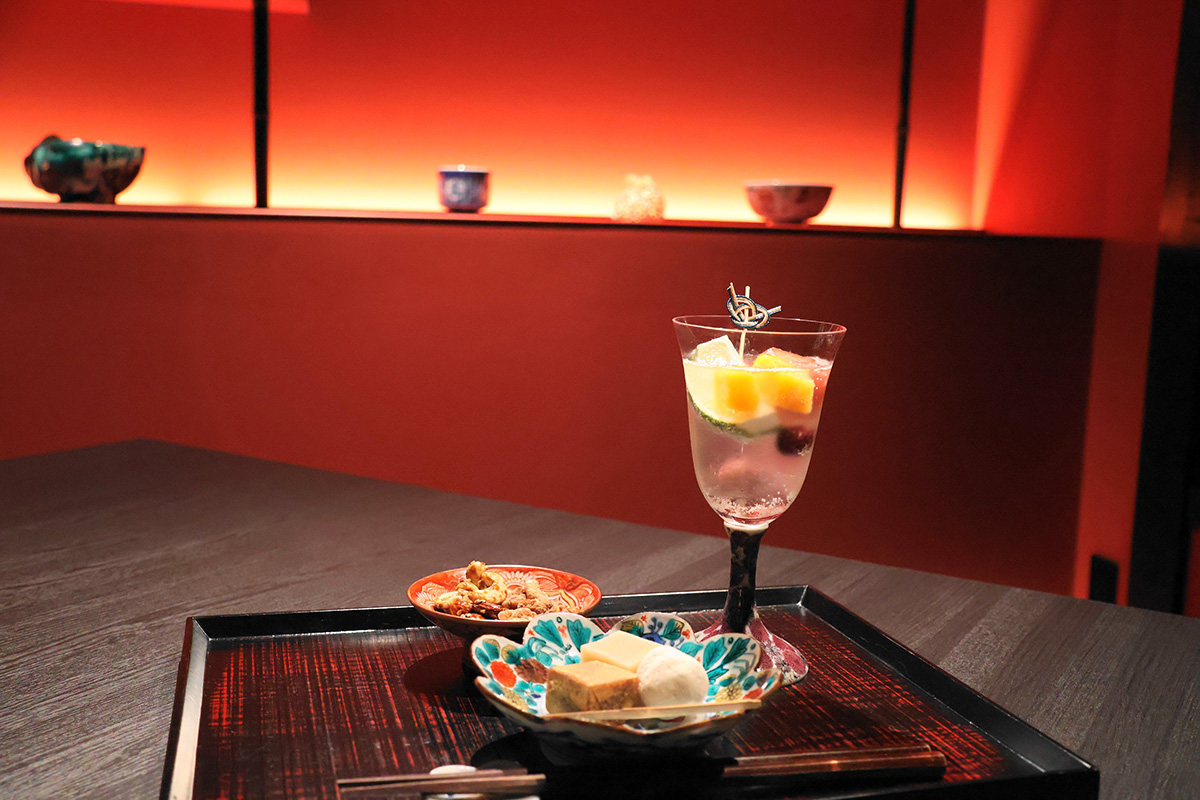 自分で選んだ器や酒器に、お酒やおつまみを盛り付けてくれます。べんがら格子など、加賀の伝統建築に囲まれながら特別な時間を過ごせますよ