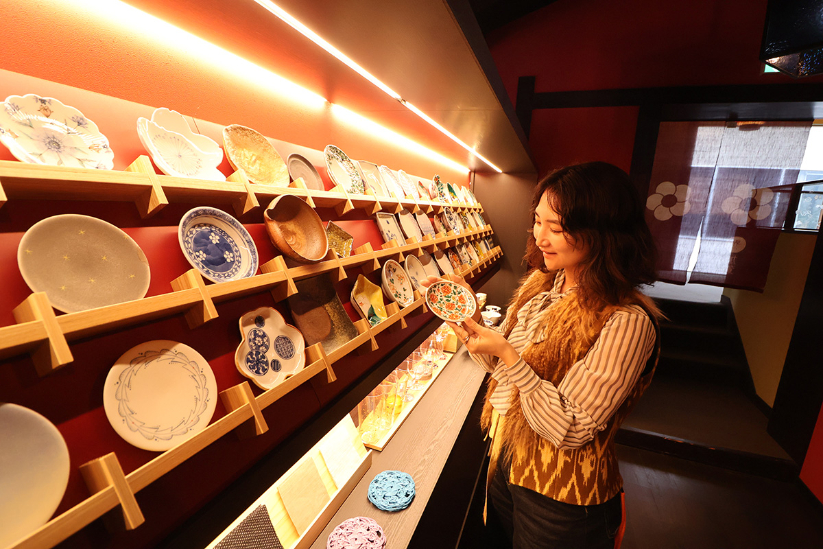 「べんがらラウンジ」では夕食後、九谷焼や山中塗などの伝統工芸品と、お酒やおつまみが楽しめます
