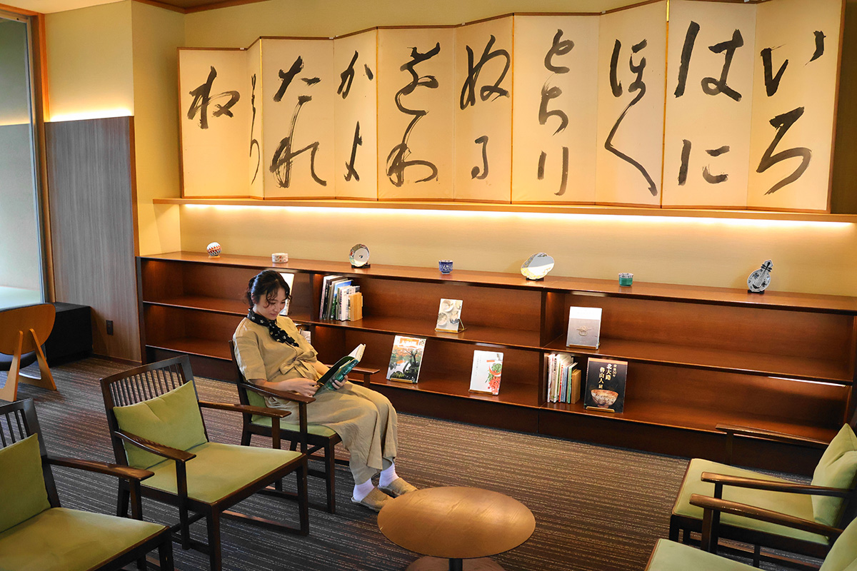 魯山人の書が掲げられた「トラベルライブラリー」。コーヒーやお茶を飲みながら、地元にまつわる本を読んだり、ゆっくりとした時間を過ごせます