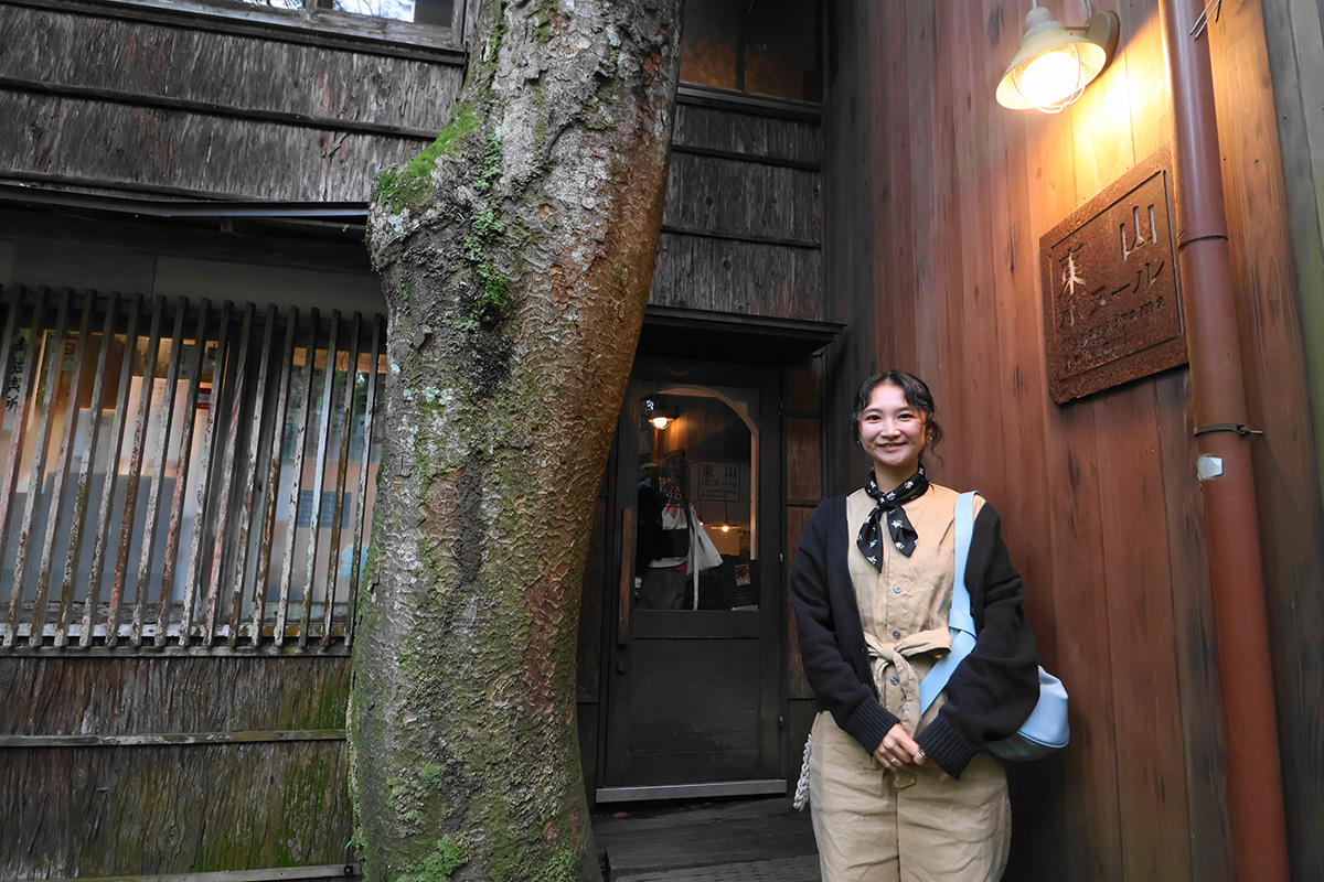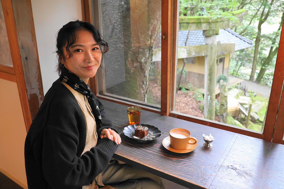 鶴仙渓の森を眺めながらのカフェタイム。旅の思い出を振り返るのにぴったりの空間です
