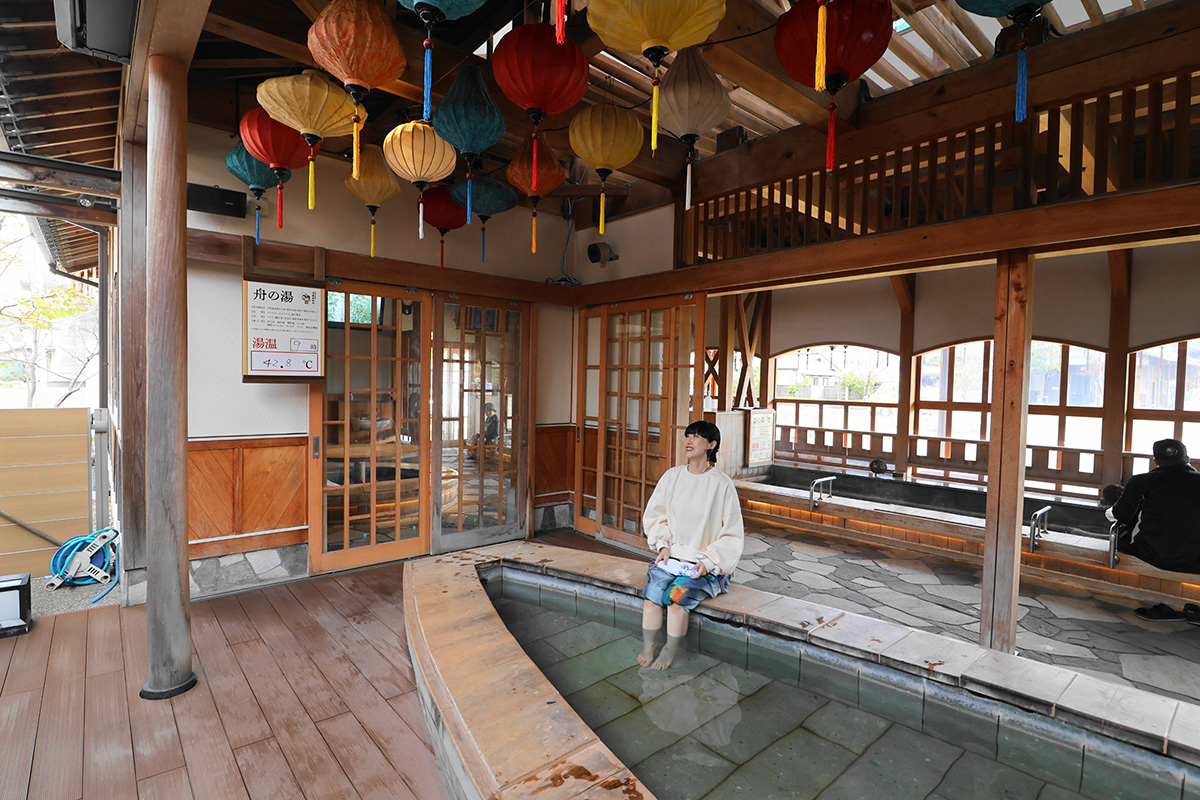 源泉かけ流し、5種類の浴槽が並ぶ足湯「芦湯」。浴槽ごとに温度や源泉が異なる、あわら温泉ならではの足湯が楽しめます