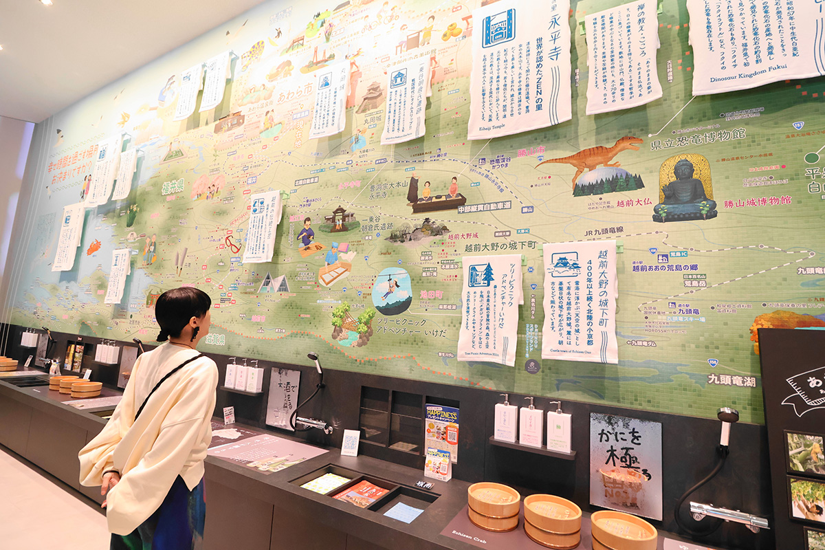 JR芦原温泉駅に隣接する「AFLARE」。2階にある「ふくいミゅ~ジアム」では、あわら市や永平寺、東尋坊などの主要観光地の情報を発信