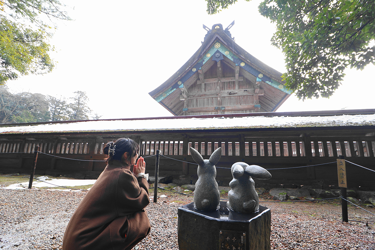 国宝に指定されている本殿の裏側には「因幡の白ウサギ」神話を思わせる可愛いウサギの像が。神苑や神楽殿にもウサギ像が点在しているので、ぜひ探してみてください♪