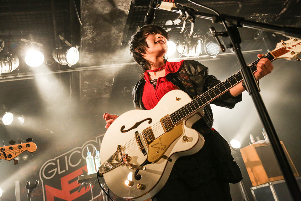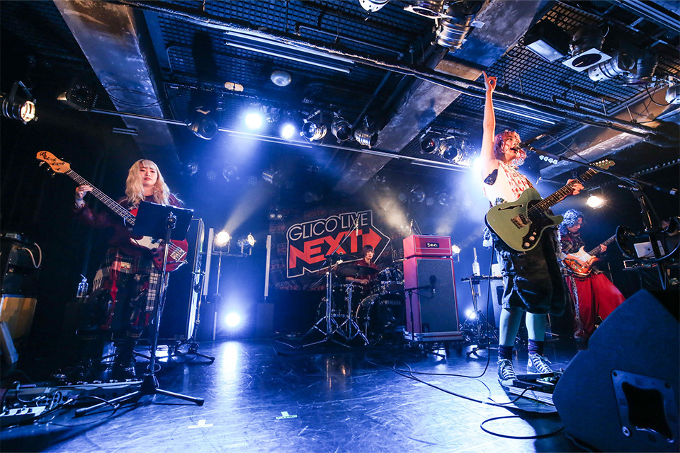 エレクトロなSEがやんだ静寂のJANUSを貫いた1曲目の「愛してるよ」から、一気に場の空気をつかんだのが伝わったyutori。「『GLICO LIVE “NEXT”』、私たちが最後ですよ。全力でかかっておいで」と呼び掛けた佐藤古都子(Vo.Gt)は、「君と癖」でもその圧倒的な歌力にオーディエンスは軒並み息をのむ。そこにダメ押しの刺激を注入するド迫力のバンドサウンド……このはかなき轟音を浴びる快感は、yutoriのライブならではだと細胞が何度でも思い出す。