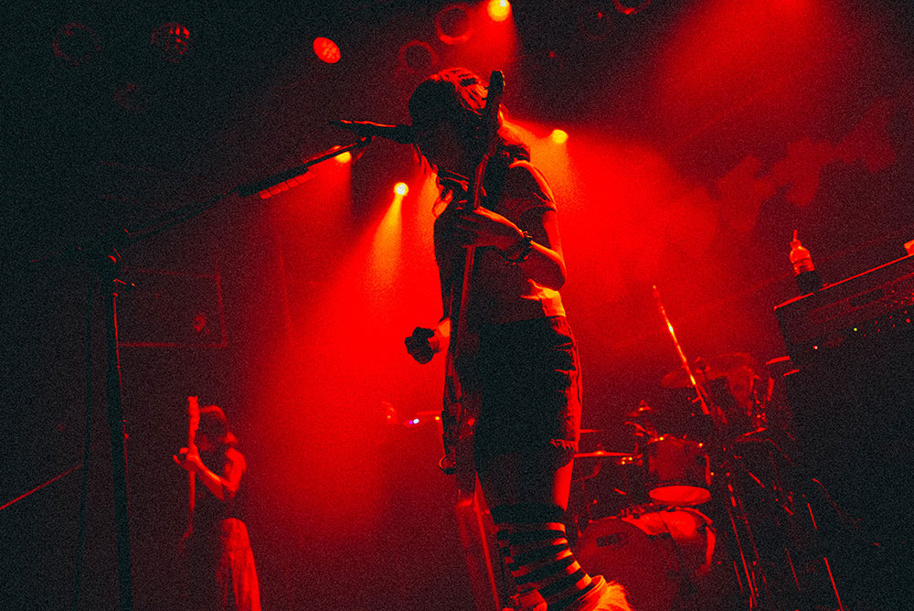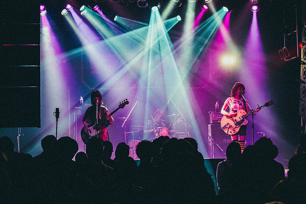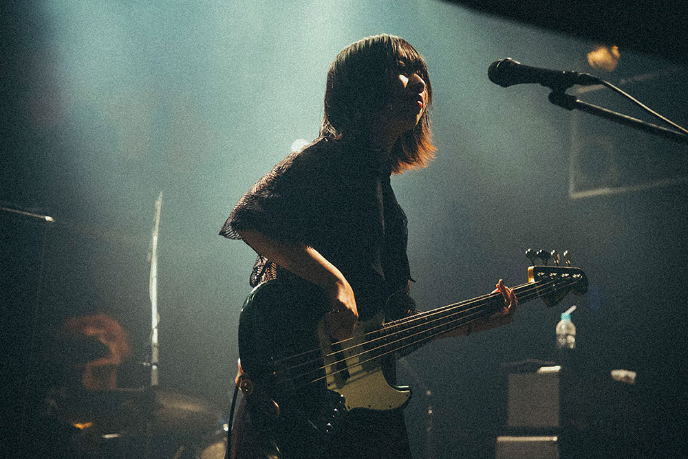 1曲目「Kids」からヘビーでダイナミックなバンドサウンドを鳴らし、蓮月(Vo/Gt)の少しハスキーで透明感ある歌声が印象深く心に刺さっていく。ノスタルジックな雰囲気漂うメロディ、タバコの煙をくゆらせるようなステージの演出もよく似合う。次曲「Musica」では、みのり(Ba/Cho)のコーラス、ボリ(Dr)の軽快かつ、しっかりと腹に溜まるビートが心地よく体を揺らす。ステージの照明はしっかりと3人の表情を照らさない、危うげな雰囲気にも心惹かれる。
