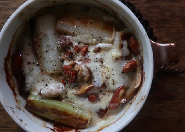 生クリームを入れ、ピザ用チーズ、ブルーチーズ、砕いたアーモンドを散らして蓋をして250℃のオーブンで15分焼きます。