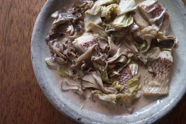 『まいたけと真鯛と発酵白菜のクリーム煮』