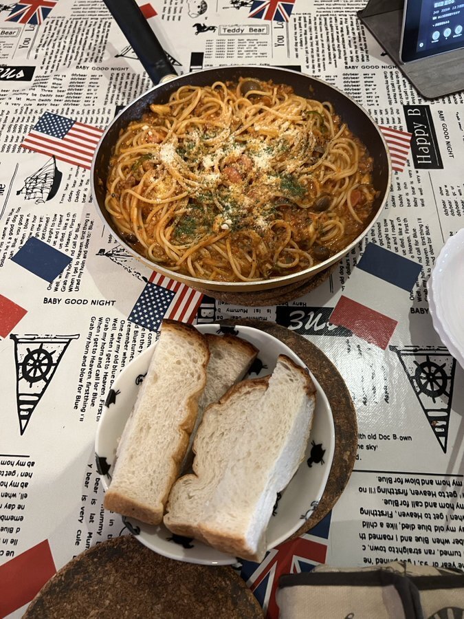 「キノコとソーセージのピリ辛ミートソースパスタ」…のお写真♪