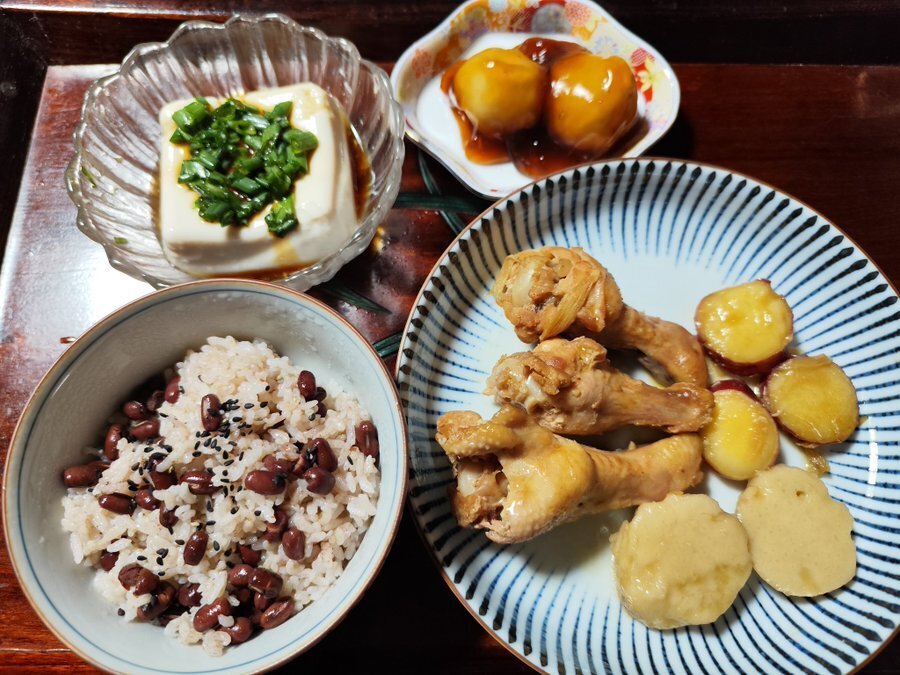 「手羽元の煮込みに、みたらし団子などたっぷりのおかず」…のお写真♪